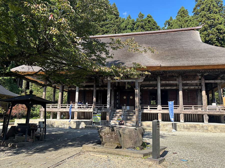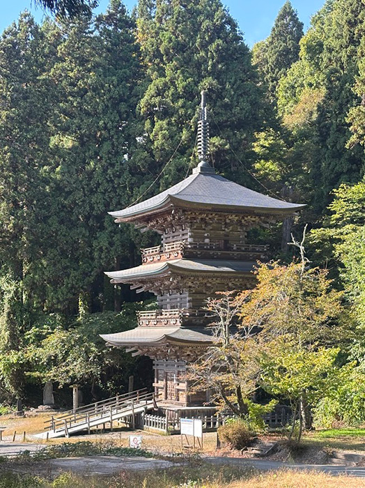 境内の西端に立つ24mの高さの三重塔。慶長13年(1608年)山形城主最上義光が建立しました。現在の塔は文政13年(1830年)に火災後に再建されたもの。建物中心部の心柱が浮いているという珍しい構造。